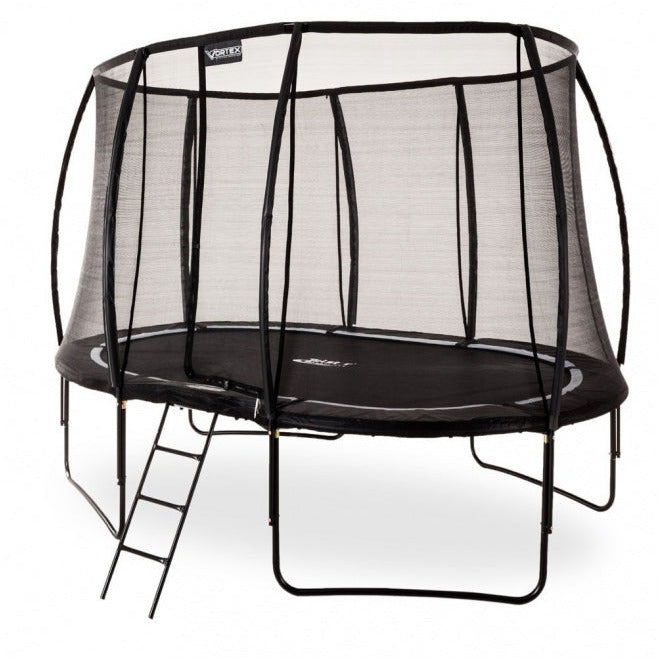 The VORTEX BLACK EDITION Oval trampoline range is Telstar’s most popular range. This model offers innovation in quality and design and this trampoline has an ‘EXTERNAL’ net. An EXTERNAL creates more space on the trampoline as the nettting stretches over the external framework.