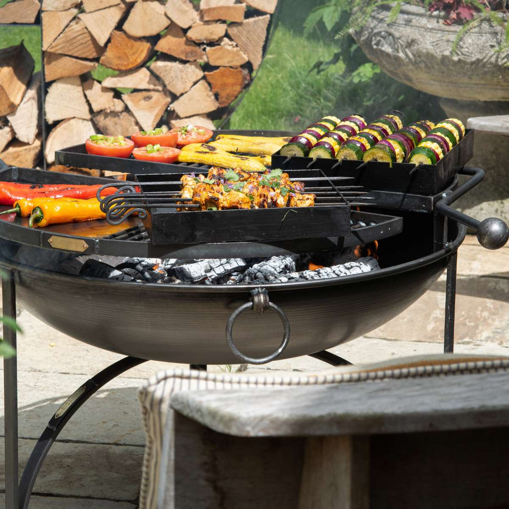 Elegant and stylish, the BBQ King 80 with two Swing Arm BBQ Racks provides a great design for maximum barbecuing. The two Swing Arm BBQ Racks are half plate and half bar to allow for ease of cooking and are fully removable after cooking so you can enjoy the warmth from the fire into the evening.Accessorise your fire pitHave a look at our Accessories section where you’ll find lots more useful extras for cooking over and managing your fire. Choose from our practical accessories such as our Fire Pit BBQ Gloves or the Ash Rake, which is great for moving hot embers around to facilitate cooking.Our Flat Table Top Lid is an essential and multi-tasking extra that we highly recommend buying with your fire pit. The lid will keep rain water and debris out of the fire bowl which will protect it. Also, crucially, the ash is dry for when you next light up. It also acts as a snuffer at the end of the evening so you know that you can safely leave hot embers to die out in your absence. And finally, when you’re not using your fire pit, the lid turns your fire pit into a table – for plant pots perhaps or that blissful garden cup of coffee at the start of the day.With so many recipe books on the market you can never be sure what will cater to you. Well, we love both Charred and Foolproof which are BBQ inspired books written by Genevieve Taylor. Charred being Veggie based and Foolproof for the meat lovers among us, there is something for everyone. Both are available to purchase via our accessories section.Personalise your fire pitDo you want to personalise your BBQ King 80 fire pit and make it stand out? Customise your fire pit with either decorative band running around the top or a personalised plaque or both! Choose from the Mosaic band, Indian band or Feather band as shown in the images. Personalising your fire pit with a brass plaque can mark a special occasion. Add that extra touch as a gift or simply as a bit of fun. Use a mixture of upper and lower case and be as creative as you like with your chosen text; ‘Cheeky’ or ‘Cheesy’, make it your own!Maintaining your fire pitNB: All our fire pits, lids and accessories will begin to rust immediately and will not maintain their black finish. However, this will not affect their long term durability. As all our fire pits are handmade from sheet steel which has naturally occurring blemishes, there may be very slight variations in the forging and finish. Please click here for handy tips on the safe use and care of your fire pit and accessories.