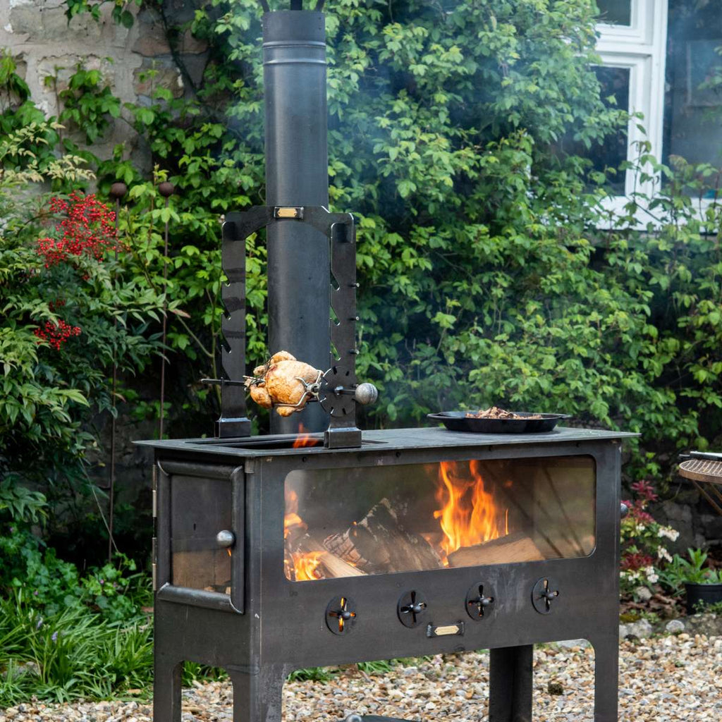 Our large outdoor wood burner BBQ is made from high quality, robust British steel, built to withstand the elements. Fire lighting is made easy with doors at either end, and if you are only entertaining a few guests, you can just use one side of the wood burner. An extended chimney of 1.5m the smoke will be taken away from your cooking area. Adjust the four air vents to help control the heat.