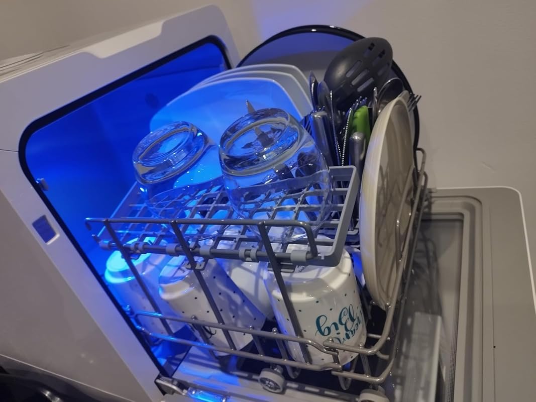 It’s been a game changer for me getting this little dishwasher. Ideally, I would have a built in slimline dishwasher, but that isn’t an option for me at the moment. I got this after 10 years of wanting a dishwasher, but the person I lived with for 10 years was against having one. I got this a few months after not living with them anymore and wasn’t sure how i’d find it. This is small in terms of what you can get in. 4 plates, a couple of bowls, a few cups/glasses, cutlery. But for a 1-2 person household, this means you can put all your small items in and then just wash up larger items like pans yourself. I got a few plates from ikea that are 25cm so I could use them in this. This dishwasher has taken the stress/time out of keeping my kitchen tidy. This makes me VERY happy. No longer are there items by the sink all the time, which I hated. No longer do I have a jenga tower of items on my draining rack all the time. It’s just made everything simpler and easier, and most importantly for me, it’s tidier in my kitchen. The wash cycles seem effective and easy to understand. I like that I can just fill it up with water. It’s all so simple. I find taking the filters out and cleaning them regularly super easy. The dishes come out squeaky clean. I put it on once, sometimes twice a day and I’m one very happy person. I just hope it lasts and works well. Time will tell. First impressions though – I am thrilled with it!