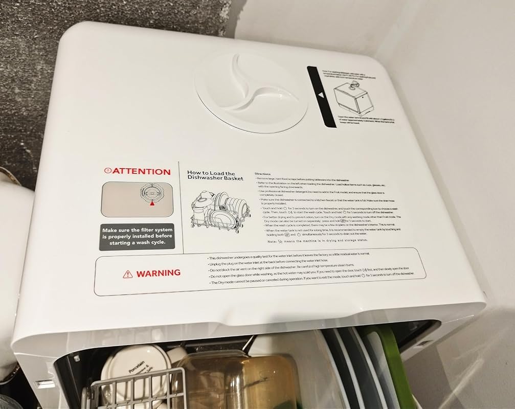 What a god send this dishwasher has been for me. I hate washing up and struggle with chronic back pain which makes it hard to stand for long periods of time. I used to leave my washing up until there was nothing left in the kitchen to use… But not any more! This compact counter top dishwasher has changed everything. The size is perfect for small places and single living, it looks great and is doing a fantastic job, I have tested it with some really dried on items and have been amazed by the results. I have it connected so that the water drains away in my sink, and I fill it with the water jug for use, but it does also come with a pipe should you wish to connect it up via the tap. It also comes with a bowl to wash fruit and has a setting to do so on the machine, I have not used this function yet, but could be handy if you are a big fruit lover. I would say it is value for money as for me, it has saved hours of pain stood at the sink. It’s not too loud when in cycle as I watch telly only yards away from the machine and it doesn’t bother me at all. Great purchase which I am very happy with, and for a compact machine I am pleasantly surprised by the amount that I can fit into it.