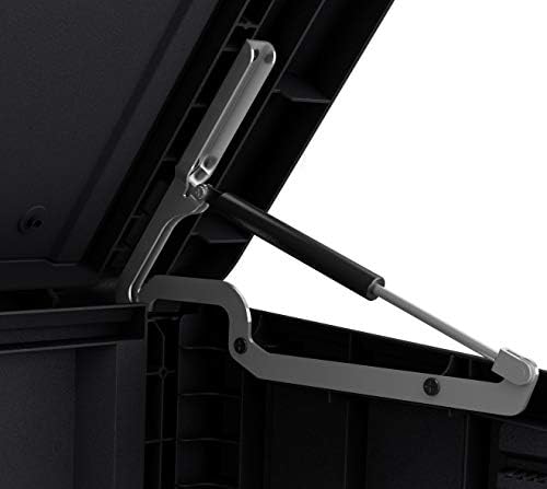 Built with weather-resistant, UV-protected materials, this storage shed is designed to withstand all seasons without fading, rusting, or peeling. The lockable doors and hydraulic piston lid provide easy access and added security, while the modern grey and black finish complements any outdoor space.